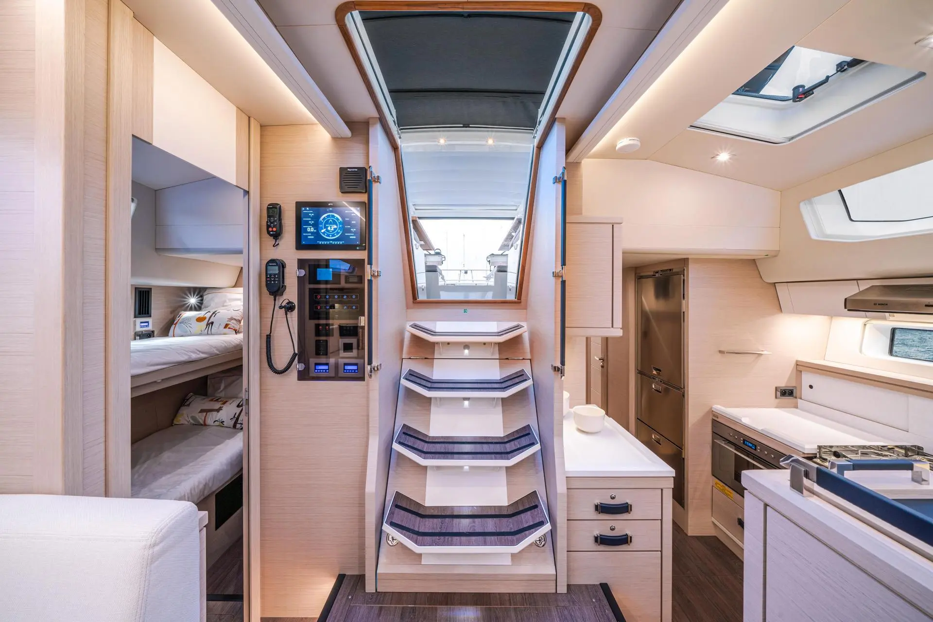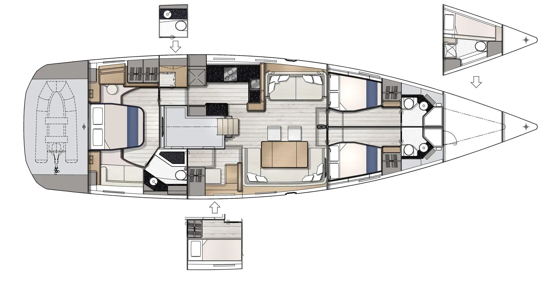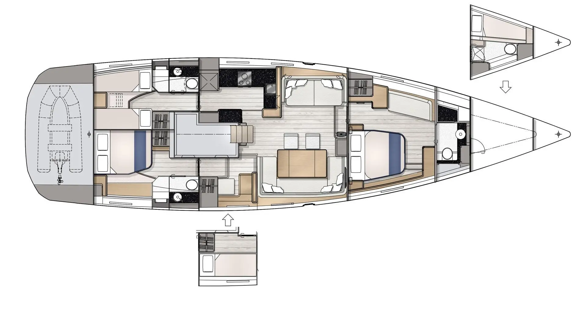 Engineered for choice, the Jeanneau Yachts 65 is a semi-custom yacht offering a variety of layouts to meet the needs of our clients. Down below, the interior can only be described as being open and contemporary, offering two choices of finishes and a host of different fabric and color options. The onboard systems have been uniquely engineered for reliability and comfort aboard while the equipment itself has been carefully selected for both quality and serviceability around the world. Given the tremendous achievements of the Jeanneau 64, the Jeanneau 65 is ideally poised for even greater success as she takes to the oceans of the world beginning later this year.